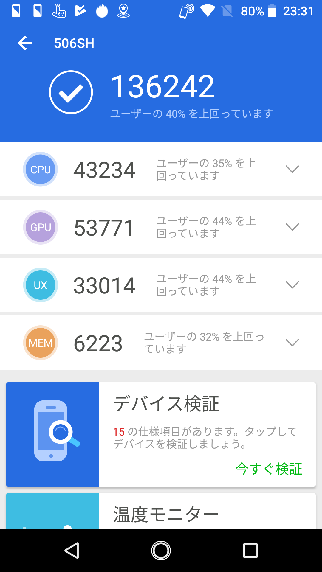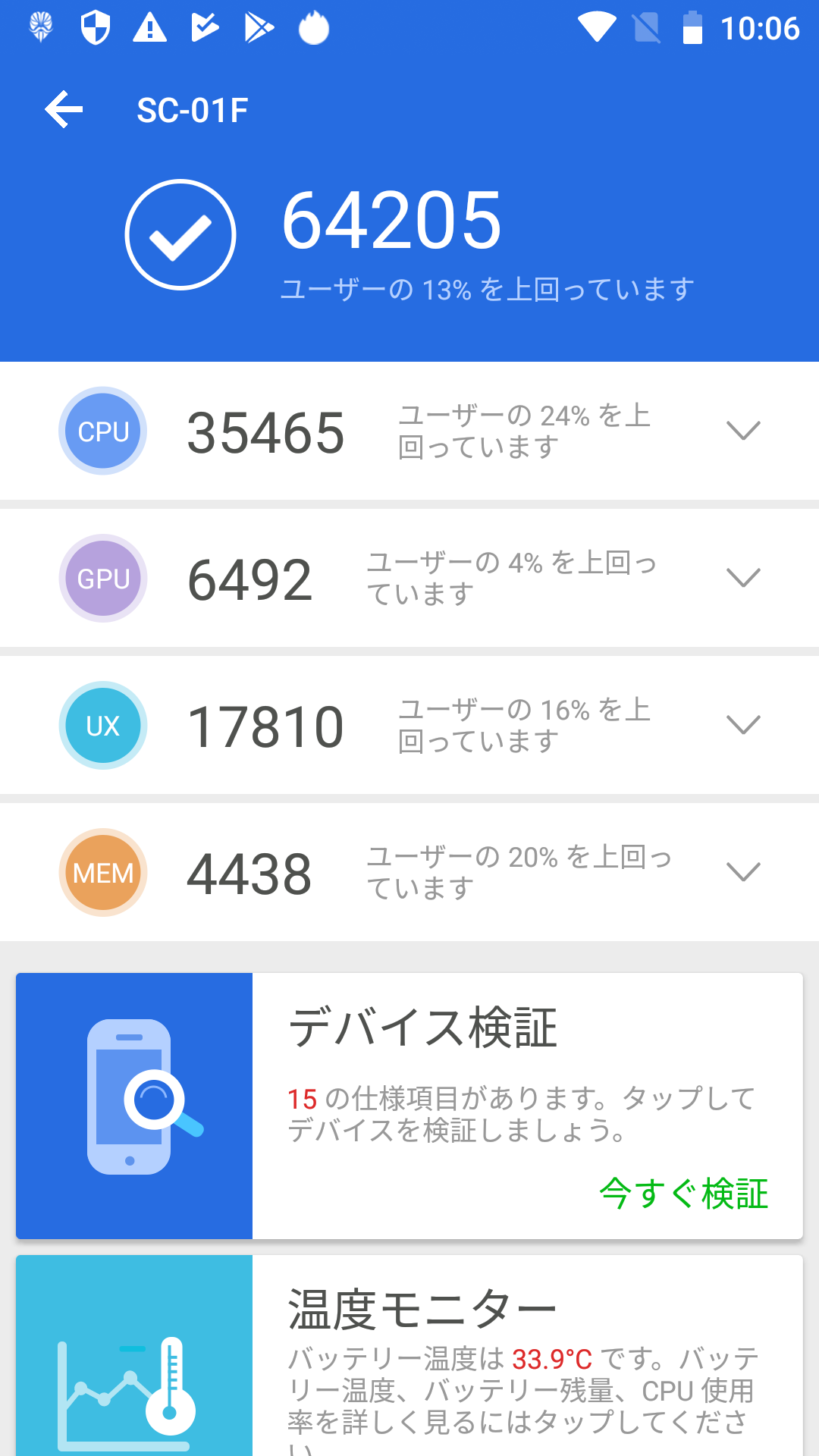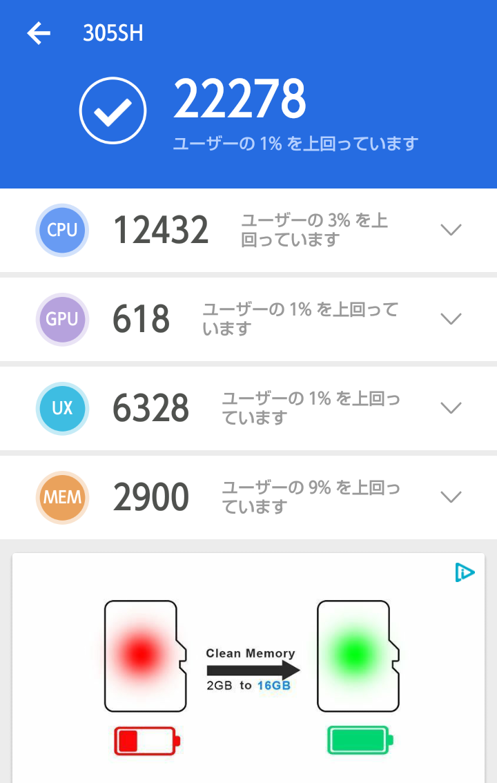 | Sharp 506SH | ほぼ iPhone 6S と同じレベル。1/3 のユーザーより速いから、ままの成績。 | 136242 | 145402 |