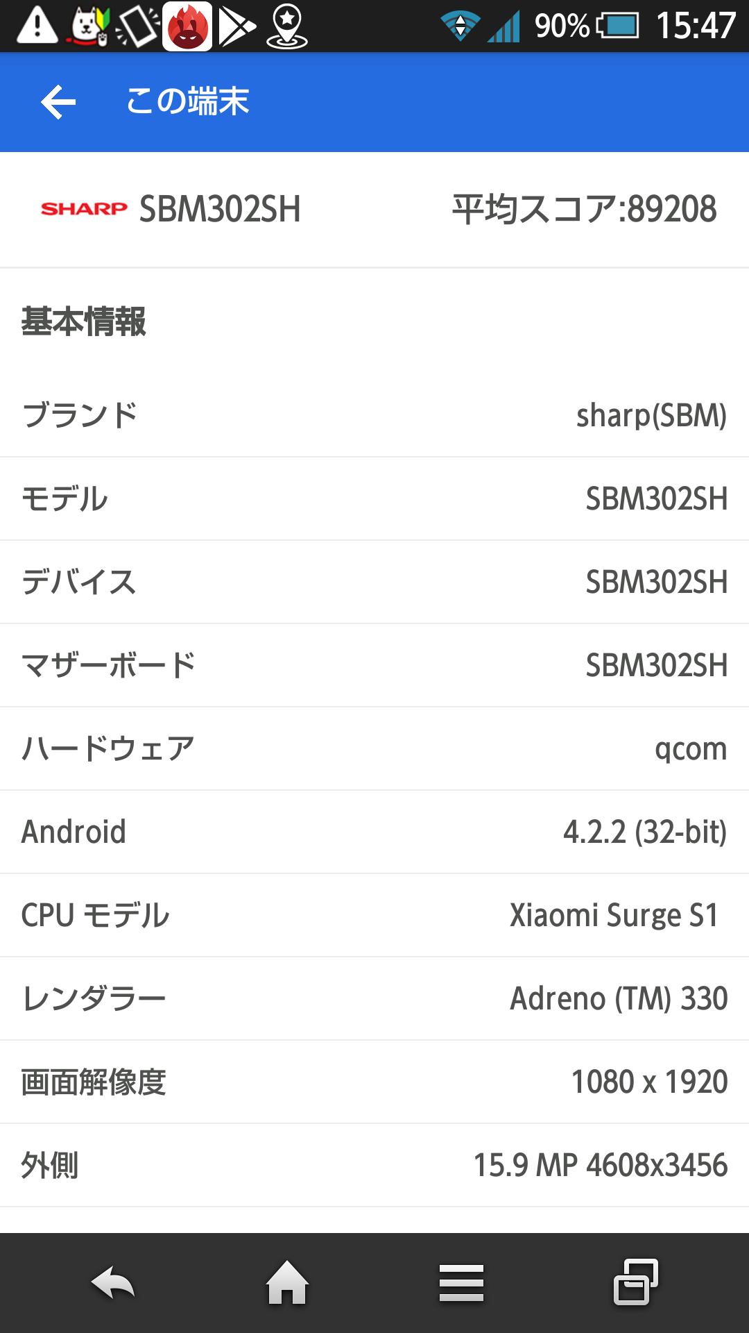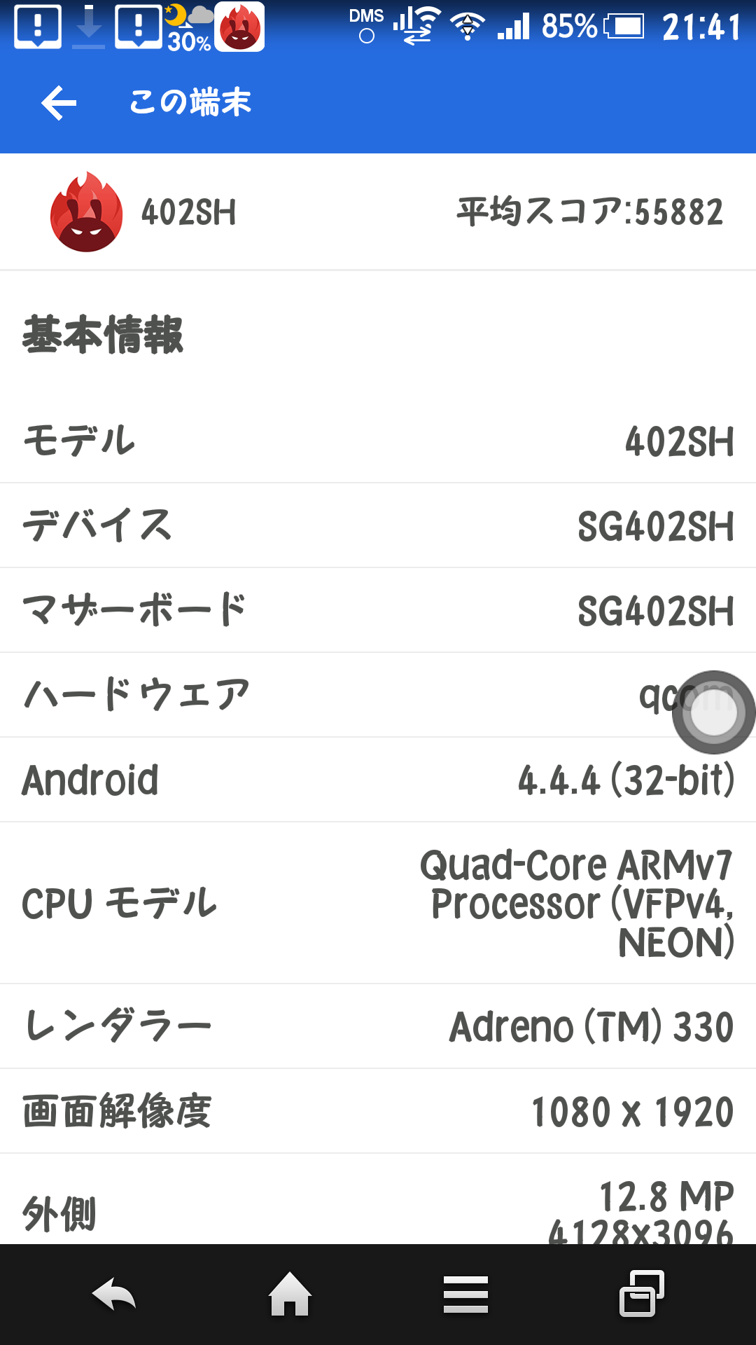 | Samsung Note 3 (SC-01F) | カスタマイズで最新 Andriod OS 8.1.0 になる。数値的には高くないが、スイスイ使える。32ビット CPU。 | 64205 | |