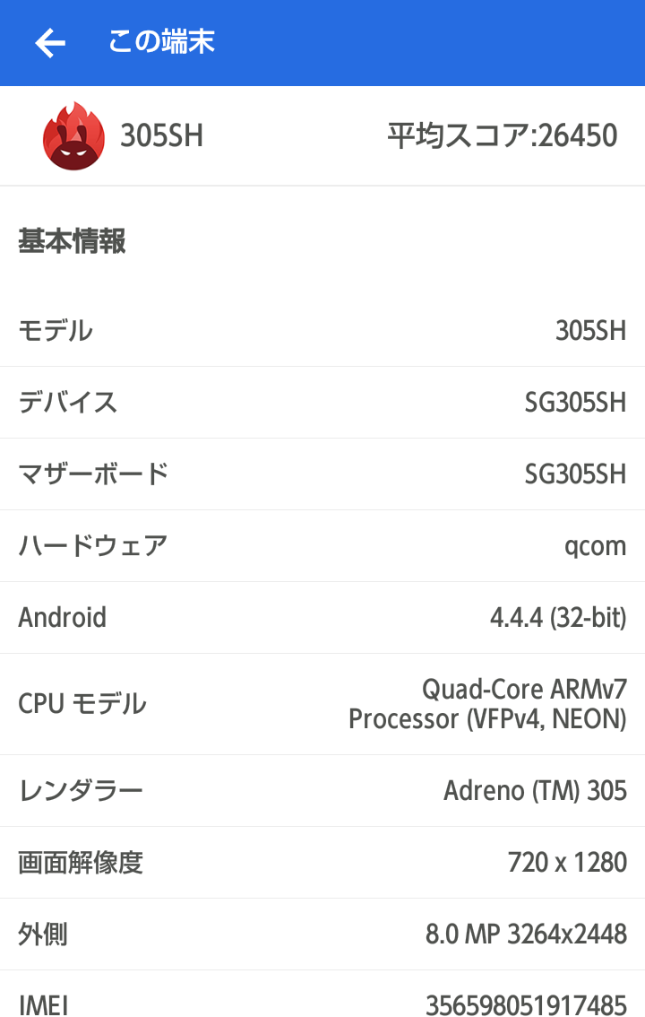 | Sharp 305SH | CPU 1.2GHz だが、64ビットCPUのため、3D Bench 実行できる。しかし、1%のユーザーしかより速い。寂しい。 | 22278 | 26450 |