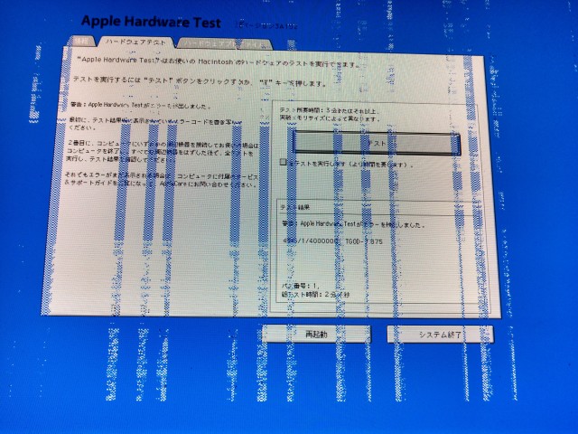 この現象は一般的にビデオチップ過熱で半田外れが主な原因。ちょっと設備もあり、修理に挑戦した。修理後、Apple Hardware Test ではエラーがなくなり、ちゃんと動作するようになった。