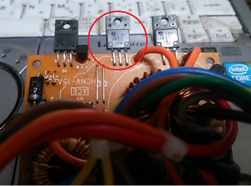 まず、パワー関係の部品をチェックした。一つ FUJI電機製 MOSFET 2SJ477 がショットしていることを見つかった。