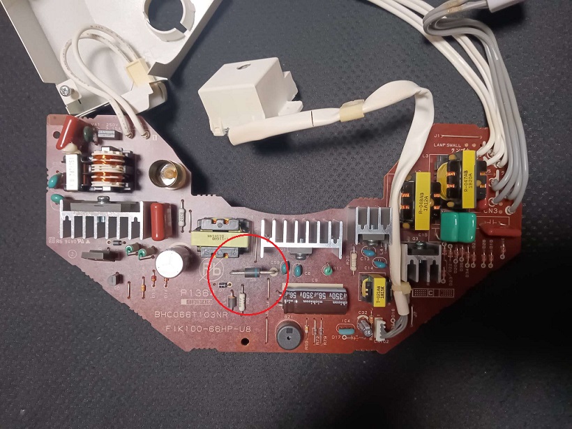 基板を確認すると、写真のように真ん中のダイオード下に変色し、過熱で焼付けたように見えます。